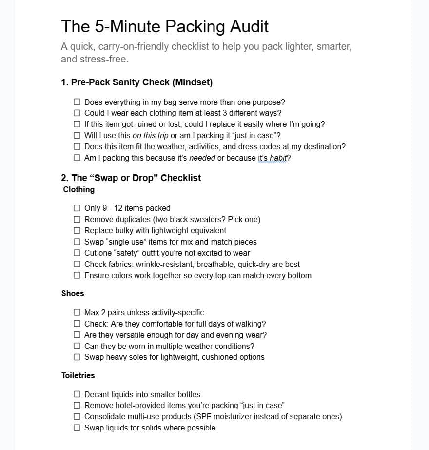 Your go-to, checkbox-ready packing audit you can use before every trip—so you instantly spot what’s weighing you down, ditch the “just in case” extras, and walk out the door with everything you need and nothing you don't.